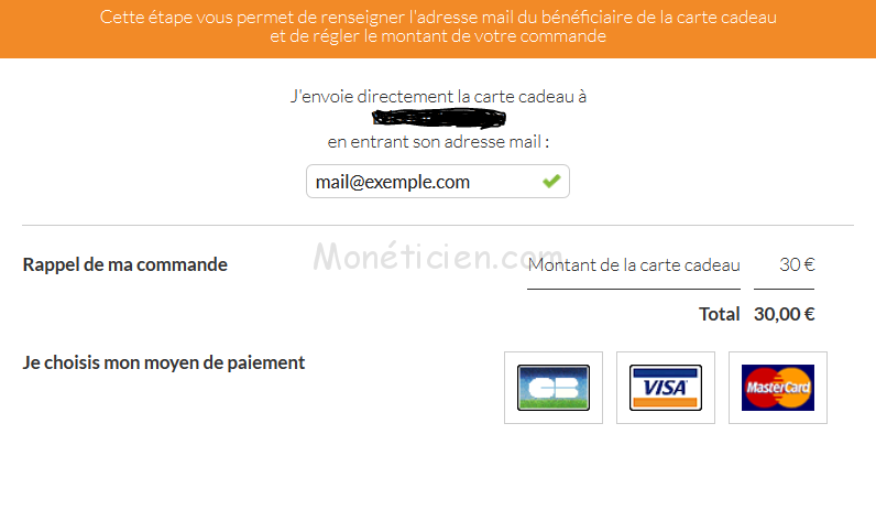 La dernière étape est consacrée au paiement de son don afin d’alimenter la cagnotte de la carte cadeau avant sa validation et envoi au bénéficiaire. La carte bancaire est, pour le moment, le seul moyen de paiement accepté.