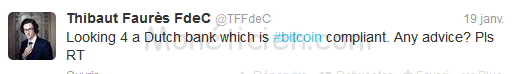 Une certitude, le sujet de la monnaie électronique intéresse les acteurs de la chaine de valeurs de la monétique et notamment les PSP (fournisseurs de services de paiement) mais aussi les établissements de paiement et les banques centrales. Par exemple, en France la société Rentabiliweb dont le Président fondateur du Groupe, Monsieur Jean-Baptiste Descroix-Vernier a annoncé la semaine dernière sa volonté de devenir un Établissement de Monnaie Électronique en ouvrant cette activité aux Pays-Bas. Information confirmée par un Tweet de son Vice-Président Monsieur Thibaut Faurès-Fustel-de-Coulanges qui recherche un acteur bancaire en Hollande « BitCoin compliant » (cf. tweet ci-dessous).
