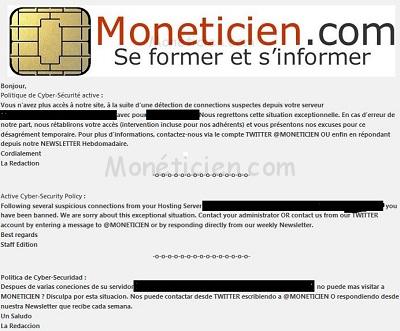 - Vous n’êtes pas adhérent : Si après un examen de votre demande (utiliser la rubrique commentaires en bas de chacune de nos pages ou sur Twitter à @Moneticien), nous constatons une ou plusieurs actions douteuses (ex: tentative de copie de notre contenu, tentatives d’accès avec un mot de passe erroné aux publications protégées, etc.). Nous ne pourrons pas rétablir l’accès à notre site car votre bannissement est justifié. Dans le cas contraire, nous vous contacterons par téléphone ou par courriel pour vous informer de notre intervention pour rétablir votre connexion.