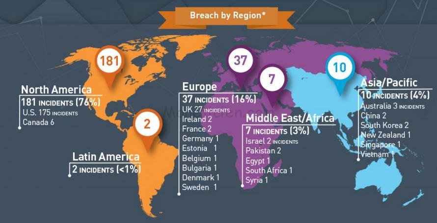 En Europe, le ROYAUME-UNI arrive loin devant les autres pays concentrant 73% des cyberattaques avec 27 cas enregistrés. Les secteurs de la grande distribution, de la santé et de la finance sont la cible prioritaire des pirates. L’entreprise MUMSNET, avec 1,5 Million d’enregistrements volés (données personnelles) arrive en tête. Pour le secteur financier, la BARCLAYS et la BITCOIN WALLET SERVICE sont citées parmi les sociétés victimes avec une évaluation de 30 000 données clients compromises.