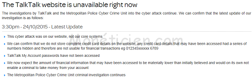 Une certaine confusion s’installe désormais et la page d’accueil du site en maintenance, depuis le 23 octobre (la cyberattaque a eu lieu 2 jours auparavant), ne rassure pas vraiment. En fait, le site a été mis en maintenance afin de permettre aux enquêteurs, spécialisés en piratage informatique, de trouver les traces de l’attaque pour remonter à la source. Entre-temps, les clients sont invités à contacter les services de Police « The UK National Fraud and Internet Crime reporting Centre » pour tout mouvement financier suspect sur leur compte bancaire. La panique s’installe désormais chez les utilisateurs de l’opérateur.